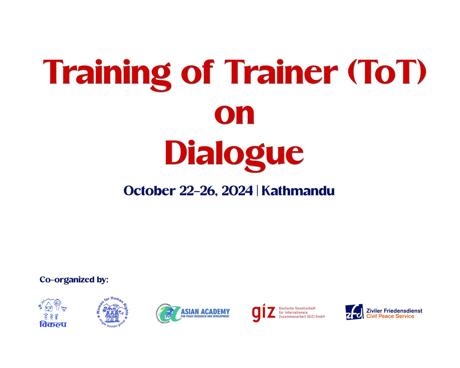 Training of Trainer (ToT) on Dialogue (REPORT) Events, Resources November 5, 2024 Start time 2024-10-22 08:00 Finished Time 2024-10-26 15:00 Address Kathmandu Content Dialogue_TOT_report[1] Training of Trainer (ToT) on Dialogue (REPORT) October 22-26, 2024 | Kathmandu